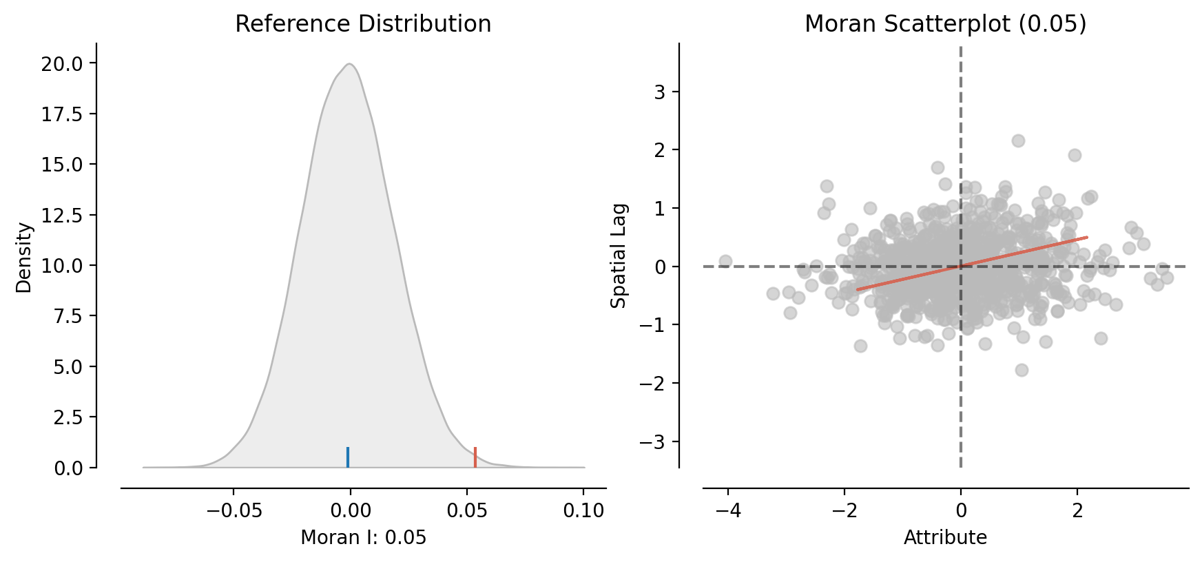 array([<AxesSubplot:title={'center':'Reference Distribution'}, xlabel='Moran I: 0.05', ylabel='Density'>,