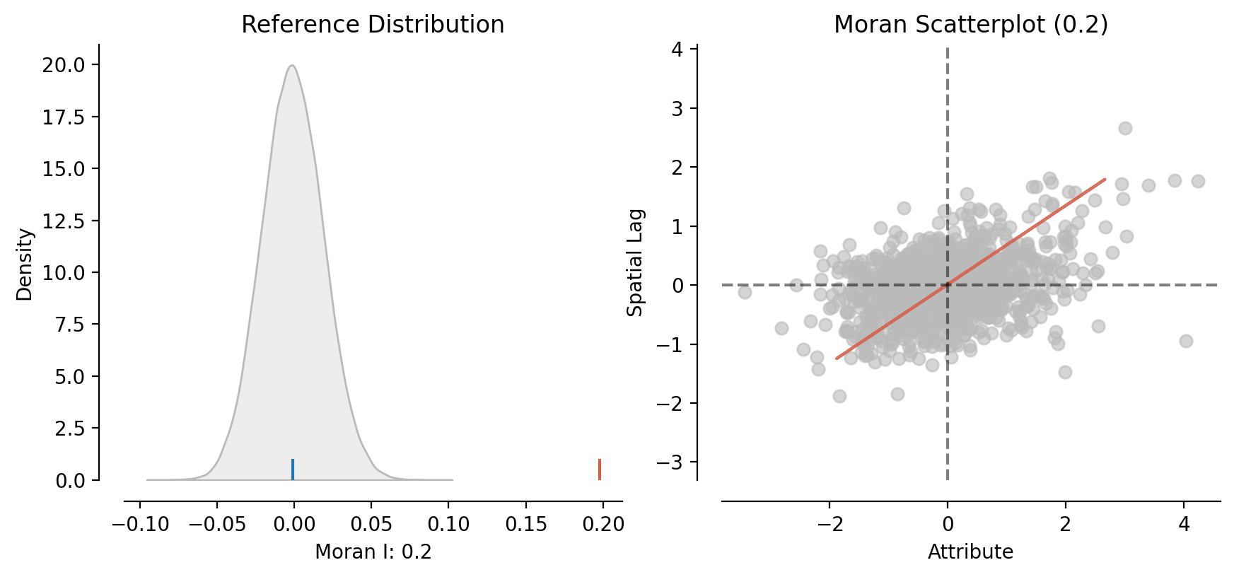 array([<AxesSubplot:title={'center':'Reference Distribution'}, xlabel='Moran I: 0.2', ylabel='Density'>,