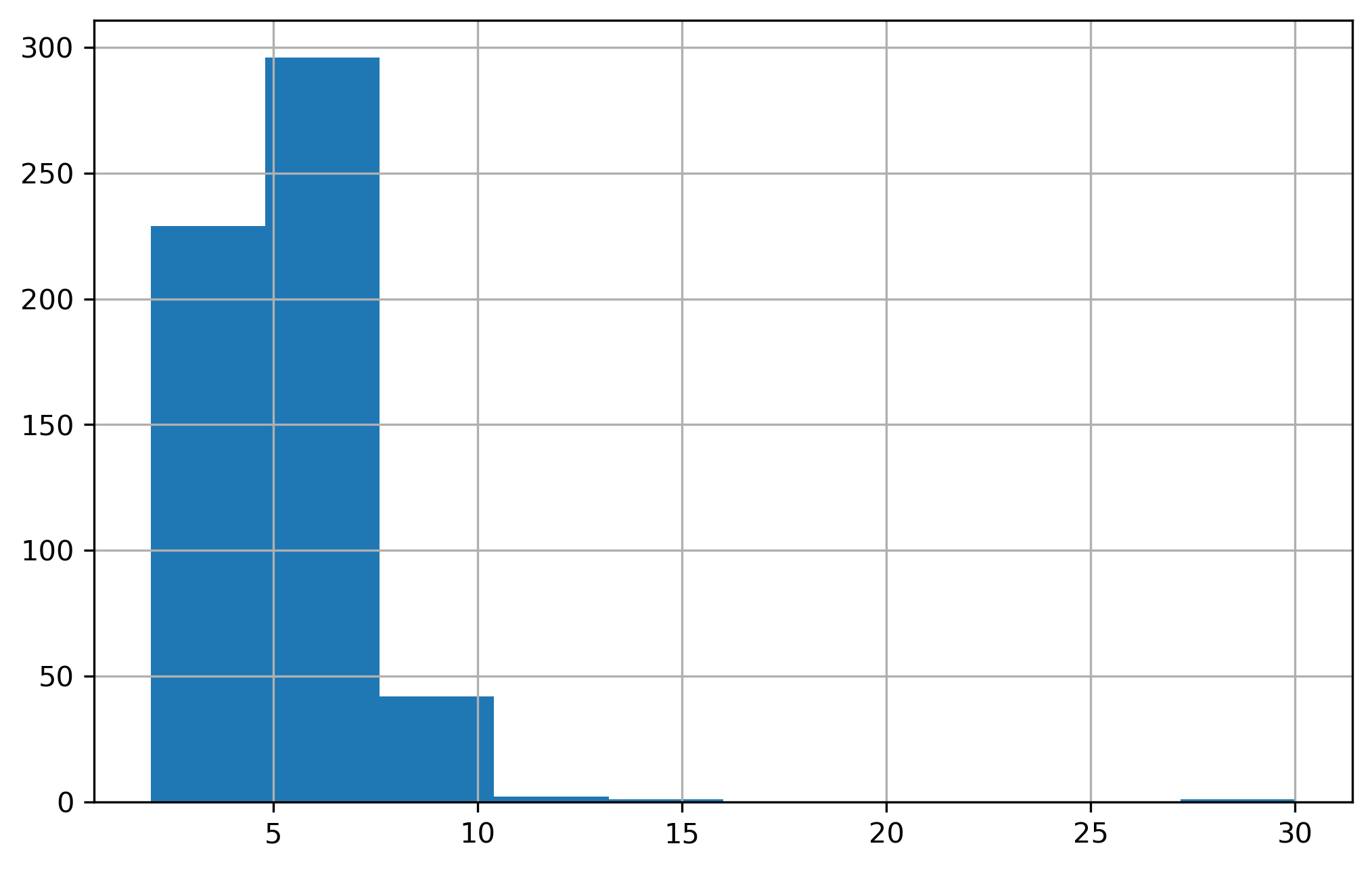 We can get a sense for what the neighbor distribution looks like by plotting a histogram of the cardinalities