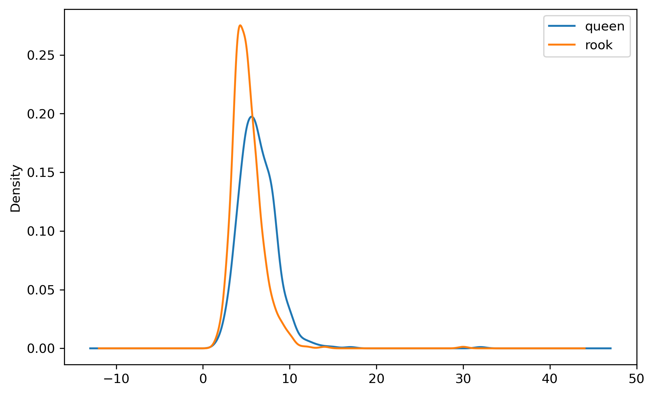 Plotting a kernel density estimate of the cardinalities of both graphs is another way to verify the difference between neighbor densities. In this case, we can see that the distribution for the Queen graph is shifted slightly to the right, indicating that, on average, Queen observations have more neighbors (which is another way of saying denser relationships).