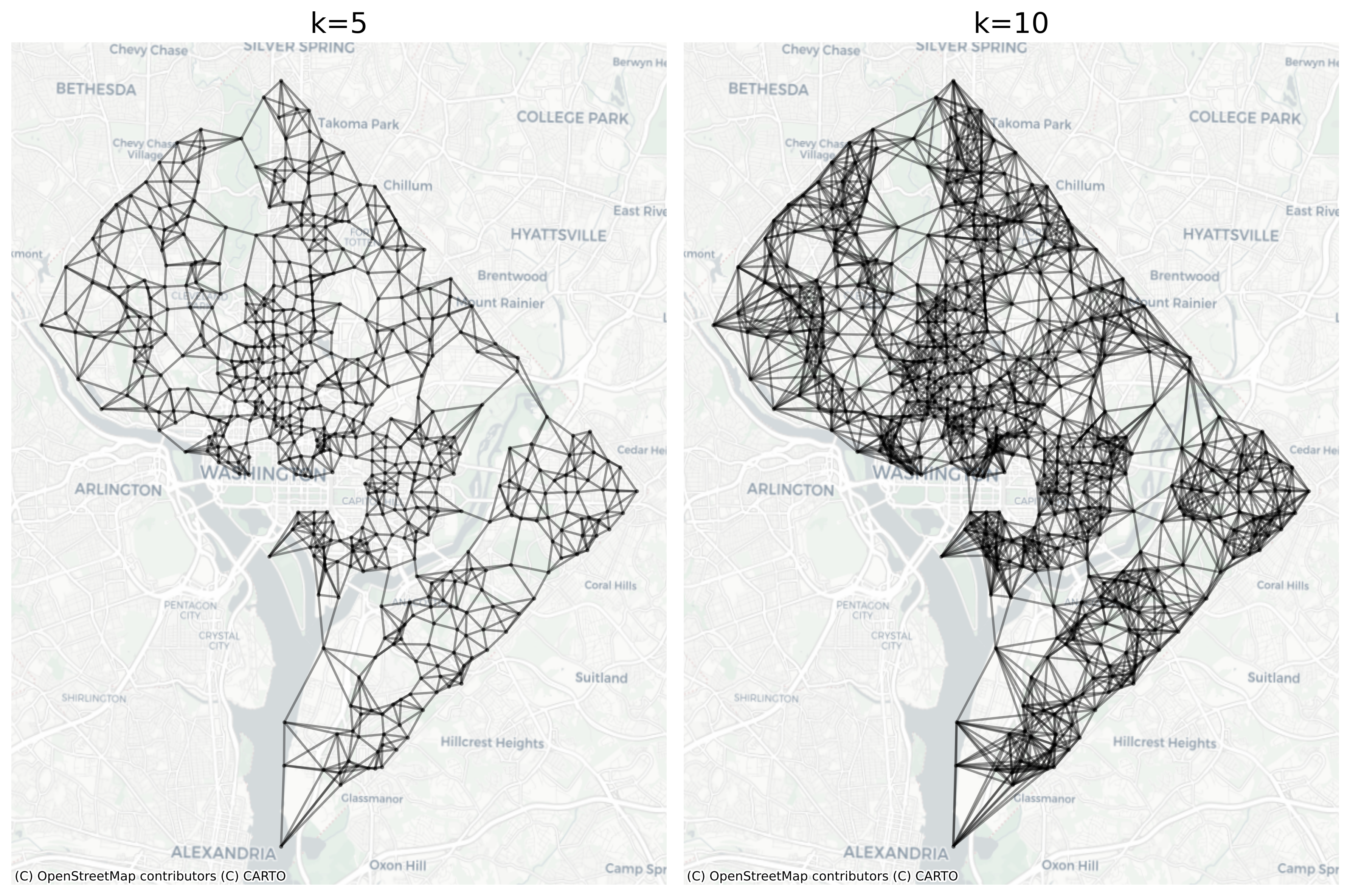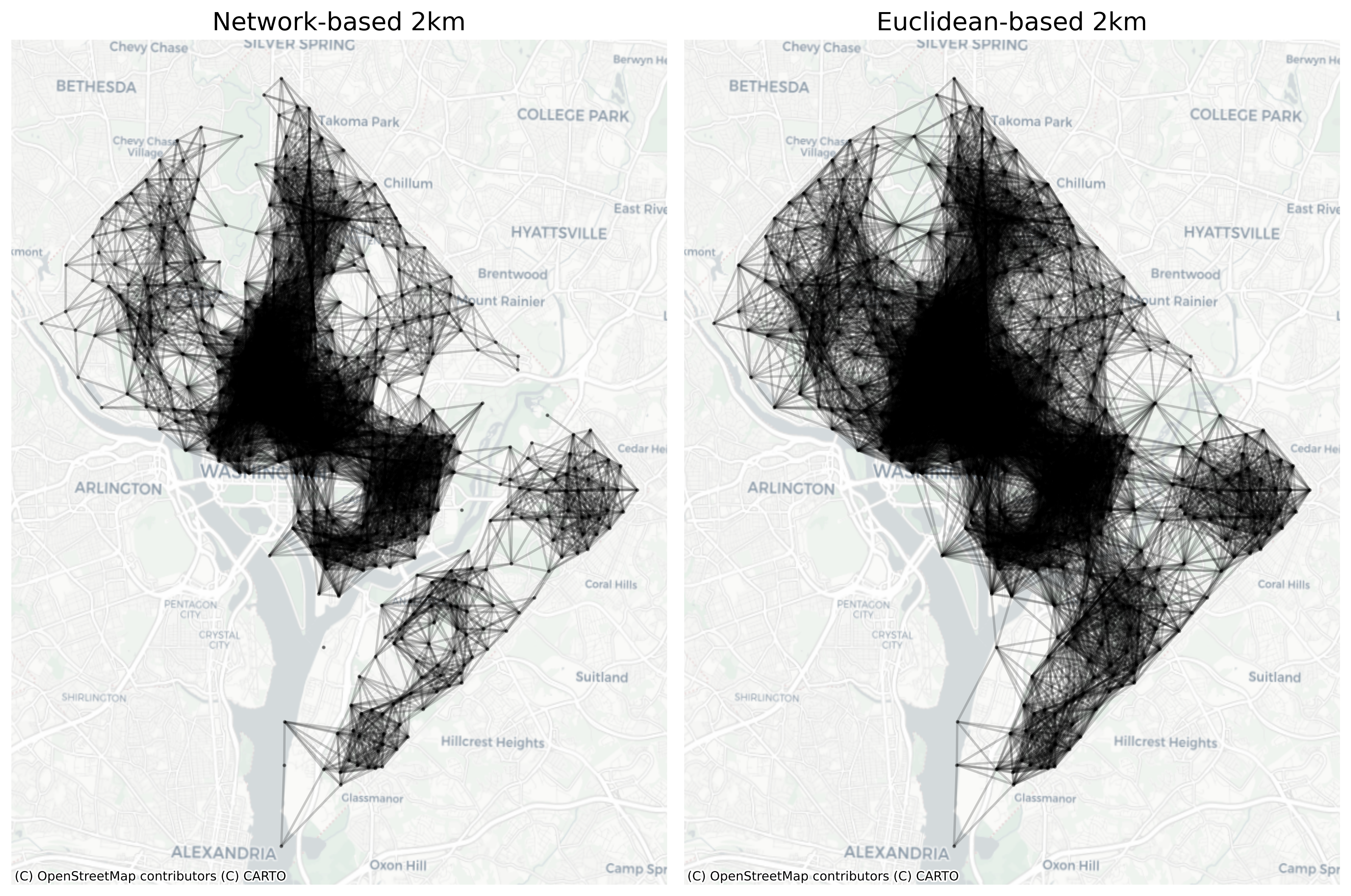 Including the constraint that distance must be measured along the walking network between observations (rather than Euclidean distance) results in some notable distinctions between the two resulting Graphs. In particular, the observations in Northwest DC are no longer connected through rock creek park, and the blockgroups in Southeast are no longer connected across the Anacostia river. This is a more realistic depiction of the potential interaction structure based on infrastructure throughput and helps show how the built environment can be used to develop alternative concepts of spatial connectivity Graphs