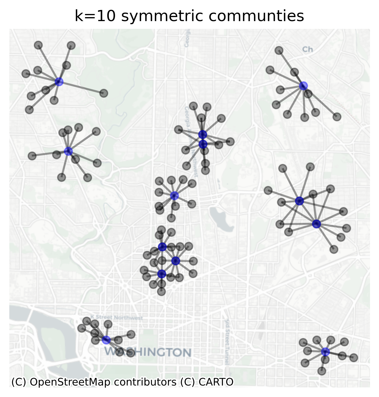 The map helps clarify the different concepts of centrality. The nodes with the highest closeness and degree centrality are in the densest parts of the graph near downtown DC. The blue subgraph shows the node with the highest degree centrality (i.e. the node with the greatest number of connections within a 1km radius), which is arguably the node with the greatest local connectivity and the red subgraph shows the node with the highest closeness centrality, which is the node with the greatest global connectivity.