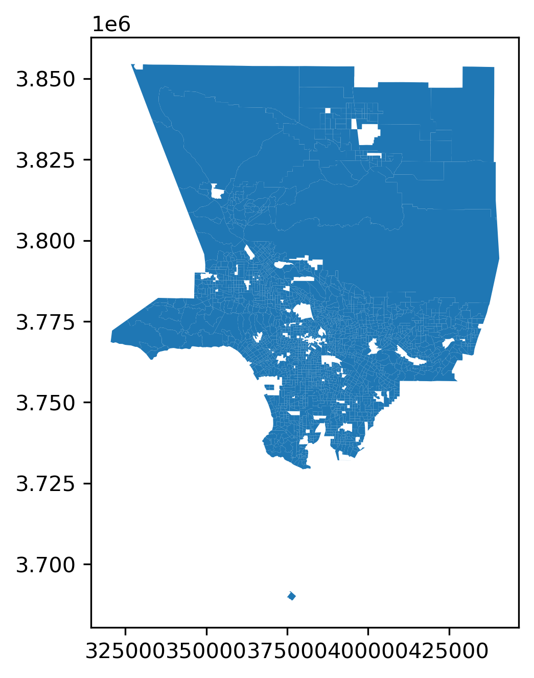 Similar to Chapter 23, we begin by loading Census data (this time from the Los Angeles metropolitan region), then generate a typology or set of regions by passing a collection of variables to the regionalize function from geosnap. In this instance, we will create 25 regions using spatially-constrained hierarchical clustering (using Ward’s linkage). Since the regionalization technique enforces a spatial constraint, we also need to pass a libpysal Graph or spatial weights object; alternatively, we can pass the name of a contiguity Graph, like “rook” or “queen”.